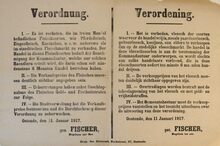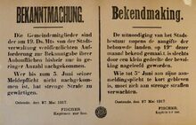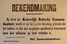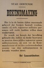Formaat : 36 x 55 cm. Kennisgeving uitgaande van het gemeentebestuur van het bevel van de Kommandantur tot verbod te bedelen en oponthoud in kwartieren bezet door militairen