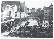 Op de braakliggende grond van de gesloopte militaire kazerne werd een levend schaakspel opgevoerd. Links de Aartshertoginnestraat en op de achtergrond de Poststraat en links de Dominicanenkerk