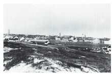 Panoramisch zicht van Mariakerke ter hoogte van de Aartshertogstraat. Op de voorgrond de piste van de Wellingtonrenbaan en de kleine vissershuisjes. Op de achtergrond de Nieuwpoortsesteenweg