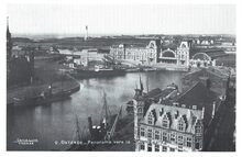 en vrachtschip richting de zeesluis die toegang gaf tot het Vlotdok. Links een pakketboot aan de kaai nabij het Zeestation.