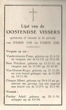 Vergaan op zee : Vanderstraeten Frans, Bens Polydoor, Van Hoorne Roger, Counye of Coenye Albert ; Vermist : Pincket Adolf, Briemont Edgar, Heinderson Armand, Bogaert Adolf ; Gestorven aan wal : Deckmyn Rudolph, Vynck, Juliaan, Vanwulpen Carolus, Barbaix Franciscus, Lambrecht Karel, Devoghel Hendrik, Lucidarme Emiel, Coenye Albertus ; Oud vissers, overleden te Oostende : Van Speybrouck Joseph, Vanwynsberghe Carolus, Rouzée Petrus, Neut Polidorus, Janssens Albertus