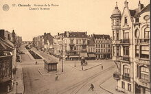 De Koninginnelaan gezien vanaf het kruispunt Petit Paris richting Drie Gapers. De werken voor deze laannamen een aanvang op 28 mei 1888. (Bulletin Communal 05/06/1888, p.242). Aanleg vanaf 1889 door de diensten van Bruggen en Wegen onder leiding van hoofdingenieur P. Demey. Boulevard met dubbele rijstroken van elkaar gescheiden door met arduin afgeboorde plantsoenen. Centraal op het kruispunt zie je het tramwachthuisje gebouwd in 1903 en deed dienst tot 1924. Rechts, het paviljoentje voor het regelen van het debiet van het rioolwater, ontworpen door Alban Chambon (ca. 1907). Tramspoor in de Torhoutsesteenweg met een aftakking
