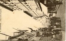 De Kapellebrug en rechtdoor de Kapellestraat. De Kappellebrug was de verbinding tussen het spoorwegstation gelegen langs de Vandersweepplaats en het centrum van de stad. Rechts, het eerste handelsdok en links, het tweede handelsdok. Links, een reclamezuil van de Stad Oostende. Op de achtergrond, de hotels Hôtel de la Couronne, Hôtel du Bassin en Hôtel Cosmopolite