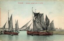Victor Grégoire/V.G. 136. - Ostende - Barques partant pour le pêche.- Bijgekleurde kaart. -Oostendse tweemastsloepen in het Schuildok. De O.216 Edouard-Marie van reder Ed. Degruyter en schipper M. Driesmans.