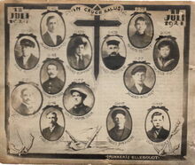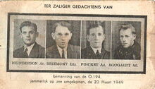 Gedenkt in uw gebeden dezielen van Basiel Blommaert (O.138), Charles Jonckheere (O.117), Charles Verbiest (O.16), Isidoor Pieters (O.18), Julien Poitier (O.108), Jacques Willaert (O.77), Louis Vanbesien (O.77), August Remaut (O.75), Jaak Eyland (O.92), Gerard Maldeghem (O.92), Gerard Blommaert (O.138), Maurice Pottier (O.108) en Leon Locquet (O.117)