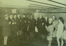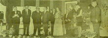 Foto : Viering van mevrouw Simone Candaele voor 35 jaar toneel. Octaaf Defoor houdt een toespraak. Ook aanwezig Raymond Miroir, schepen en Fritz Content, voorzitter van het Conservatoriumtoneel. (Photo AndrΓ©)