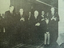 2 foto's : (1) Burgemeester Jan Piers, provincie-gouverneur Pierre van Outryve d'Ydewalle, Raymond Decloedt en zijn zoon Jean-Jacques en (2) Raymond Decloedt houdt zijn toespraak (Photo AndrΓ©)