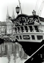 De "Grand Turk" in het Mercatordok. Gebouwd in 1988 als replica voor de BBC-serie Captain Hornblower. Op de achtergrond de Sint Petrus en Pauluskerk en de Vindictivelaan.