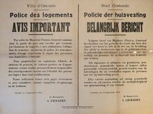 Formaat : 62 x 85 cm. Kennisgeving uitgaande van de burgemeester A. Liebaert van het bevel van generaal Clooten ter herinnering aan de bevolking van de plicht inlichtingen te geven aan de politie over het verblijf van personen die in Oostende niet gedomicilieerd zijn