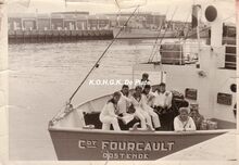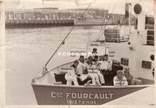 Formaat :Β 13 x 9 cm. - Klasfoto Zeevaartschool Oostende 1967. Foto genomen op het achterdek van het schoolschip Commandant Fourcault, gemeerd nabij de Zeevaartschool. V.l.n.r. :Β Moeskops Roger,Β Van Der Elst Juuri,Β Peeters Wilfried,Β Van Mullem Alain,Β Lozin Axel,Β Van Houtven Wilfried. Boven : Mortier