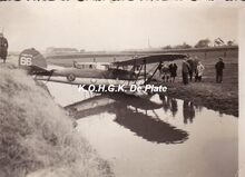 Foto 12 x 9. Brokkenlanding van een Gloster Gladiator uit Schaffen. Het vliegtuig van de Belgische luchtmacht kwam terecht in het Provincie Geleed aan de zuidkant van het veld. Aan de horizon rechts van de boerderij, onderscheidt men de schoorsteen van de steenbakkerij "Briqueteries Nationales", in de Stationsstraat (Stene)