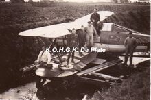 Foto 8.5 x 6. Een Gloster Gladiator, jachtvliegtuig van het "La Comète" smaldeel van de Belgische Luchtmacht, na een kraaklanding in het Provincie Geleed.