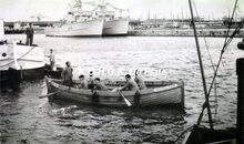 Foto 15 x 10 kopie van postkaart. Leerlingen van de Vrije visserijschool Paster Pype krijgen roeidril in de handelsdokken. Op de achtergrond twee mijnenvegers en het tramstation.
