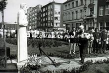 Foto 18 x 13. Ex invent 35/96d. Inhuldiging van het gedenkteken Paster Pype. Standbeeld in witte natuursteen op vierkante sokkel met aan de voet van het beeld een scheepsanker. Het staat in de plantsoenen van de Sint Petrus- en Pauluskerk, kant Jozef II-straat.