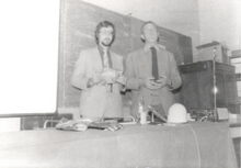 Formaat : 9 x 12,5 cm. - Foto genomen in de lokalen van de Vereniging voor Familiekunde tijdens de voordracht "Schelpen in de vokskunde" door de heer Van Walleghem op 30 april 1981
