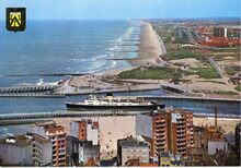 Op de voorgrond, de Visserskaai, de garnaalmijn en het Montgomerydok. Pakketboot Prince Philippe"p in de havengeul van Oostende.