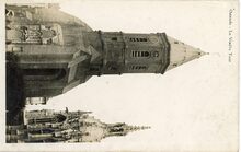 De oude toren van de Sint-Pieterskerk (bijgenaamd de Peperbusse). De kerk werd door brand vernield op 14 augustus 1896. Rechts, een gedeelte van de Koninginnekapel van de Sint-Petrus- en -Pauluskerk.