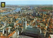 J.V.D.B. 102/19. - Panoramisch zicht op de havengeul, de Oosteroever met de Halve Maan en verder het strand en de duinen van Bredene