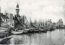 Vissersvaartuigen in het eerste handelsdok langs de Vindictivelaan. Het Zeevaartcommissariaat of Pilotage en het Zeestation