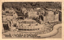 U.P.B. - Ostende - Vue aérienne du Casino-Kursaal. Oostende - Luchtfoto van het Derde Kursaal. We zien de noordgevel van het derde Kursaal langs de Albert I-promenade. De Leopoldlaan die leidt naar het Leopoldpark. Links, de Kursaal-Oosthelling. Rechts, de glooiing van de zeedijk naar het Groot Strand.
