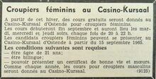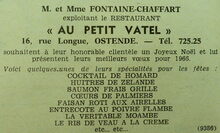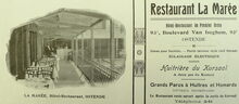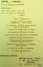 Hôtel-Restaurant de premier ordre. Salons pour sociétés. Partie terrasse style Viel Ostende. Eclairage éléctrique. Huitrière du Kursaak. A deux pas du Kursaal. Grands Parcs à Huîtres et Homards. Nouveaux propriétaires. Le restaurant reste ouvert après la sortie du Kursaal. "De Oostendse dagbladen "L'Echo d'Ostende" en "Le Carillon" signaleerden eind october 1898 de vestiging van een nieuw oesterpark achter het "Etablissement Hydrothérapique" aan de Oosthelling Kursaal. Het oesterpark betrok trouwens zijn zeewater langs dezelfde leidingen als die kuurinstelling. Meteen al was een restaurant voorzien en Eugène Gaspar, die we al kennen als directeur van Delbouille's oesterputten "Park" (Delbouille was inmiddels overleden) werd aan het hoofd van de instelling geplaatst. Het hotel-restaurant opende zijn deuren op zaterdag 8 juli 1899. En het was in vele opzichten een eerde originele aangelegenheid : er was eerst en vooral een ultra-moderne grill-room, een nieuwigheid in die dagen. Maar de blikvanger was ongetwijfeld het restaurant. Men kwam er door een grote vestibule die uitgaf in de Van Isehgemlaan, over de Belpairestraat (toen nog Laboratoriumstraat). Het restaurant was een soort terras rondom de oesterparken aanlelegd, tevens als een soort wandeling. Men kon er vanzelfsprekend een somptueuze maaltijd tot zich nemen, maar ook gewoon iets drinken. Dat restaurant-terras nu, was schitterend gepland en gedecoreerd door de architect Antoine Dujardin en zijn medewerker A. Hubert. Als thema had Dujardin "Oud Oostende anno 1614" gekozen, in navolging van zijn versieringen der Kursaalrotonde voor liefdadigheidsfeesten, die kort voordien zo'n successen waren geweest. Het werd een geromantiseerde weergave van die typische kleine volkse huisjes met kleine deuren en vensters en die schattige topgeveltjes. 's Avonds werd heel dat decor electrisch verlicht en dat was ook weer een nieuwigheid." Oostends oesterboek / Raoul Halewyck, Norbert Hostyn. 1978. p.51-52. Plate bib B179