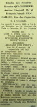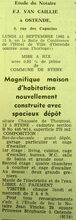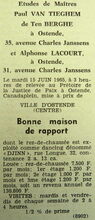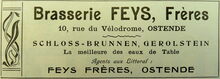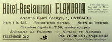 Près des Bains, Kursaal et Nouvelle poste, arrêt du tram élect(r)ique.Diners à fr. 2.50. Pension depuis 6 francs. Maigre les Vendredis. Chambres depuis fr. 2.50, service compris. Spécialité de poissons. Huîtres et homards. Pol Verhulst, propriétaire. Affilié à la Ligue Vélocipédique Belge.