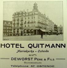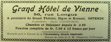 A proximité du Grand Théâtre, Digue et Kursaal, Ostende. Propriétaire : Hector Vindevogel. Chambre et déjeûner depuis fr. 3.50. Pension complète de fr. 7.50 à 12 francs par jour. Monopole pour le Littoral de la Fürstenberg blonde Impériale. Boisson de table de S.M. l'Empereur d'Allemagne