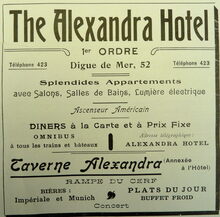 1er ordre. Splendides appartements avec salons, salles de bains, lumière éléctrique. Ascenseur Américain. Diners à la carte et à prix fixe. Omnibus à tous les trains et bâteaux. Taverne Alexandra (annexée à l'hôtel). Rampe du Cerf. Bières : Impériale et Munich. Plats du jour. Buffet froid. Concert