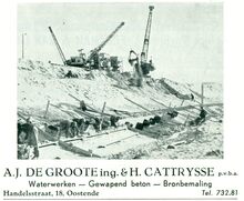 AndrΓ©-Joseph De Groote en Hector Cattrysse associeerden zich in 1934 en stichtten in 1943 een pvba, die op 01/01/1960 tot naamloze vennootschap werd omgevormd. De firma neemt water-, grond-, hei-, riool- en betonwerken aan, alsmede de constructie van industriΓ«le gebouwen, bruggen, enz. Tot haar referenties behoren de lage havendam en rioleringswerken te Oostende, het zuiveringsstation te Brugge-Sint-Pieters en de brug van Snaaskerke. Zij biedt werkgelegenheid aan 160 arbeidskrachten. In : Dit is West-Vlaanderen : steden, gemeenten, bevolking : dl.2 / Lucien Dendooven. Flandria, 1960. p.1278