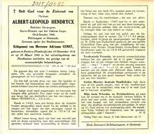 Formaat : 8 x 13 cm. - Hendrycx Albert, politieagent, sectie-overste geheim leger, muzikant. Overleden in het vernietigingskamp Nordhaüsen op 19 maart 1945.