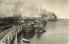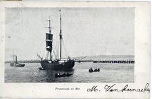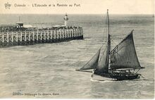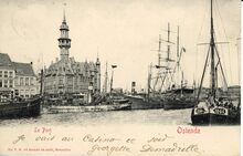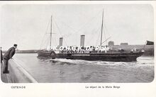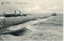 Nels 13, 31. Ostende - Le port. Départ de la malle. - Pakketboot La Flandre vertrekt naar Dover. Vooraan het Ooststaketsel met op het einde het tijseinpost. Het schip werd in 1888 afgeleverd. Het liep 17 knopen, hetgeen de reisduur van Oostende naar Dover terugbracht tot 3u40. Op dit schip werd achteraf voor het eerst een elektrische verlichtingsinstallatie aangebracht. Op 15 oktober werd Oostende door de Duitse troepen bezet en die legden beslag op de twee pakketboten La Flandre en Leopold I en op het visserijwachtschip Ville d'Ostende. Op 6 oktober 1918 hadden de Duitsers de haven versperd, vooraleer op 16 oktober de stad te ontruimen. In de havengeul lieten ze twee baggerboten en de oude maalboot La Flandre zinken.