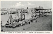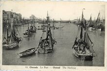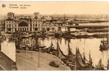 Het eerste handelsdok met de talrijke vissersvaartuigen. Links het Zeestation en de Vindictivelaan.