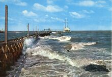 Vissersvaartuig O.34 Frans-Julia (type Oostends Schipje), schipper François Pieters en reder Michel Pieters. We zien het Weststaketsel met op het einde de mistbel en het Café-Paviljoen.
