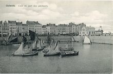 Vissersvaartuigen in het Schuildok en op de achtergrond de Visserskaai met zijn talrijke cafés. Helemaal rechts het gebouw van de bestendige reddingsdienst