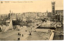 Algemeen zicht op de Hazegraswijk. We zien de handelsdokken en de Kapellebrug. Rechts, het tweede spoorwegstation (Oostende-Stad) gelegen aan de Vandersweepplaats, nu Ernest Feysplein