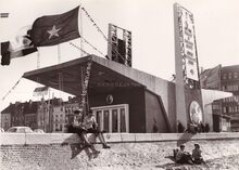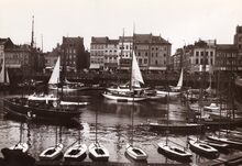 Het vuur is aangemaakt om de schouw het laatst overblijfsel van de verbrandingsoven neer te halen.Β Op de achtergrond de Konterdamkaai met de spoorweg. Rechts, de woningen inΒ de Wateringstraat , gekend als de "Garre". De straat was de enige toegansweg vanΒ de wijk Meiboon tot de Konterdam