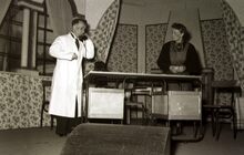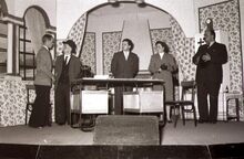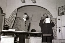 Toneelvereniging "Dageraad" een scene uit een opvoering in een wijkzaaltje.