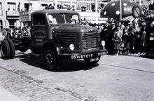 Vrachtwagen Steyr diesel van garage Aerauto, St. Pieterskaai 37, Brugge in de Driftweg te Brugge tijdens de zomercavalcade.