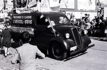Een reclamewagen van de firma Heuzel-Seys, Kerkstraat 3,Β Oostende, Noordstraat 18, HeistΒ in de Driftweg te Bredene tijdens de zomercavalcade. Op het dak van het voertuig reclame voor de naaimachines Bernina en Phoenix.