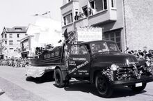 De praalwagen "Admiraal Pophan" van de Koninklijke Maatschappij de Vereenigde Karabijnschutters.Β Sas Slijkens, getrokken door een vrachtwagen, Chevrolet, van Houthandel, zagerij, schaverij, J.C. Claeys, M. Versluys Oostende,Β in de Driftweg te Bredene tijdens de zomercavalcade.