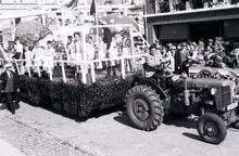 Praalwagen met jeugdige voetballers in de Driftweg te Bredene tijdens de zomercavalcade. Tractor Zetor 25.