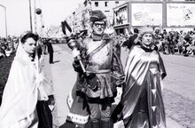 De eerste carnavalprins van Bredene, Maurice Lauwereyns, als Maurits I in de zevende zomercavalcade te Bredene. In zijn hand een indrukwekkende scepter. Een sierlijk bewerkte staf met op de top een houten mossel vervaardigd door Camiel Geselle. Hij is getooid met een groot erelint in rood-witte kleuren, met in gouden letters "Prins Carnaval 1954". Maurits I.Β Rechts de groothertogin (Elisa Beernaert) en links de prinses (Yolande Beniest).Β (Jaarboek Ter Cuere 1996)