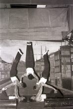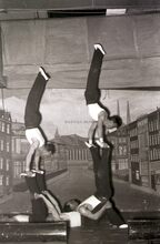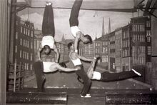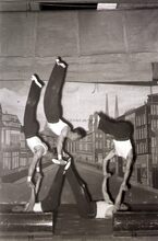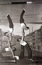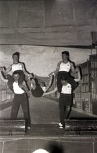 Optreden van een turnvereniging in een theaterzaaltje te Bredene (?).