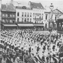 Wagen nr. 15 van de maatschappij "Kunst Genegen". Op de achtergrond, de stadsbibliotheek, op de hoek met de Loouisastraat