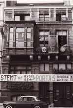 Modeshow van huis UREEL in een Oostends restaurant,de mannequin voor de tafel van de jury (?).