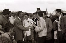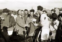 Prijsdeling na afloop van het paastornooi hockey 1954 op het terrein Koningin Astridlaan - Koninginnelaan.