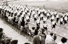 Een afdeling jonge athleten tijdens het zomerfeest Hermes op hun stadion.