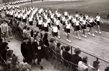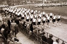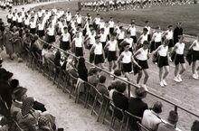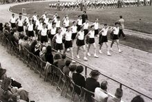 Jonge turners geven een demonstratie op het zomerfeest op het Hermes stadion aan de Torhoutse steenweg - Steense Dijk.