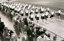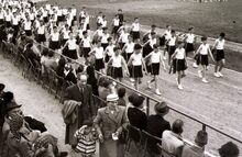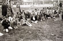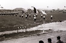 De deelnemers aan het zomerfeest Hermes 1954 staan opgesteld met hun vlaggen op hetstadion aan de Torhoutse steenweg- Steense dijk.