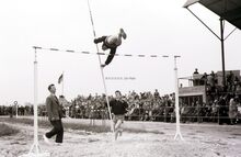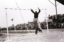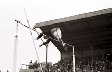 Een polstokspringer bij een poging op het zomerfeest van Hermes op hun stadion.